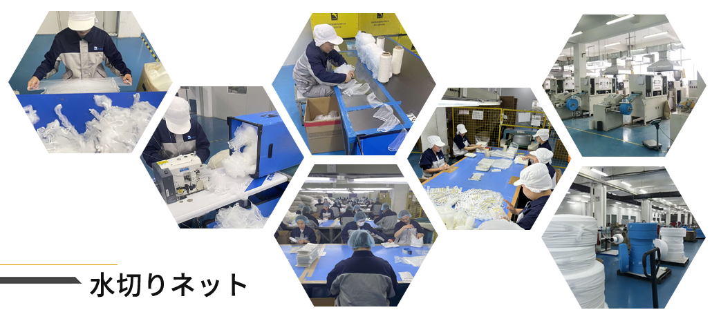 當(dāng)社のストッキングタイプ水切りネット、不織布水切り袋と水切りネットの生産量は日本市場の50%以上を占めています。ストッキングタイプ水切りネットの編み機(jī)は600臺(tái)があって、兼用と淺型と細(xì)型などを生産できます。水切りネットの生産ラインが19臺(tái)があります。不織布水切り袋は平型の機(jī)械とマチツキタイプの機(jī)械全部で8臺(tái)があります。月に三種類の水切りネットは1.58億枚を生産できます。